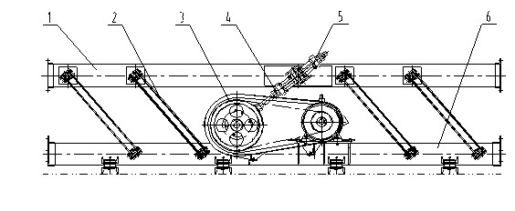 FZS型單質(zhì)體連桿振動(dòng)輸送機(jī)的結(jié)構(gòu)由1輸送槽、2主振板彈簧、3驅(qū)動(dòng)機(jī)構(gòu)、4連桿、5連桿螺旋彈簧、6底架等組成。驅(qū)動(dòng)機(jī)構(gòu)由電動(dòng)機(jī),皮帶輪、傳動(dòng)軸、偏心裝置組成,輸送槽與底架之間用板彈簧聯(lián)接,該板彈簧既是主振彈簧,又起輸送槽振動(dòng)導(dǎo)向作用,輸送機(jī)運(yùn)行中驅(qū)動(dòng)機(jī)構(gòu)使連桿端部作往復(fù)運(yùn)動(dòng),而連桿通過(guò)其端部的螺旋彈簧帶動(dòng)輸送槽作往復(fù)運(yùn)動(dòng),使物料沿振動(dòng)方向被連續(xù)拋起向前跳躍,達(dá)到輸送物料的目的。